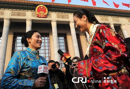 2011年3月5日,北京,青海電視臺的來忠(右)慕名而來,與啟米翁姆(左)一段藏語交談后親如姐妹。當日,來自四川的康巴衛視的藏族女主播啟米翁姆在人民大會堂前一站,就再次受到代表和記者的關注。