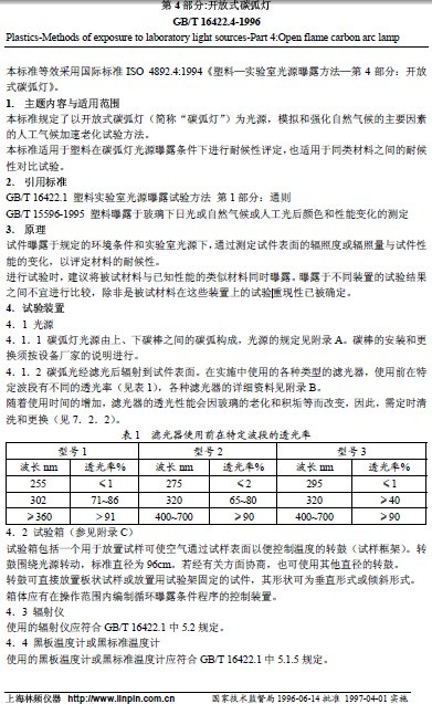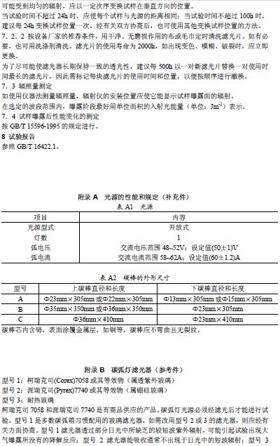 GB/T 16422.4-1996塑料實驗室氙燈光源曝露老化試驗方法:http://www.jolliplay.cn/uploadFile/softdown/2008103142397005.pdf