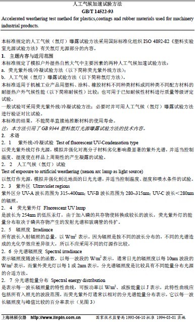 GB/T 14522-93 機械工業(yè)產(chǎn)品人工氣候加速試驗方法:http://www.jolliplay.cn/uploadFile/softdown/2008103142102365.pdf