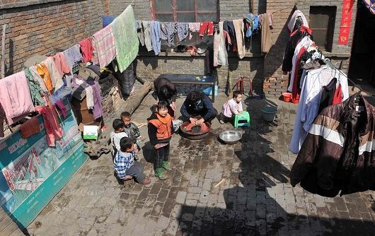 李艷萍在為孩子們洗衣服,這是她每天必做的“功課”。李艷萍1964年出生于山西省汾陽市牧莊村,21歲那年嫁給孝義市瑤圃村村民任學功為妻。從外表看來,李艷萍看起來顯得很憔悴,這是十幾個孩子吃喝拉撒在她身上留下的印記。李艷萍家的院子里到處曬滿了大大小小的衣服,顯示著這座狹小的農家院落的與眾不同。