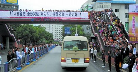 9月26日上午,因救人被江水卷走的武警戰(zhàn)士劉先東、楊磊的追悼會(huì)在攀枝花市中心廣場(chǎng)舉行。運(yùn)有兩名武警戰(zhàn)士骨灰的車(chē)輛從武警攀枝花支隊(duì)第三中隊(duì)出發(fā),駛往攀枝花市中心廣場(chǎng),沿途上萬(wàn)群眾護(hù)送兩名戰(zhàn)士。中午12時(shí)許,在家人的陪同下,劉先東、楊磊“乘坐”K118次列車(chē)回家。