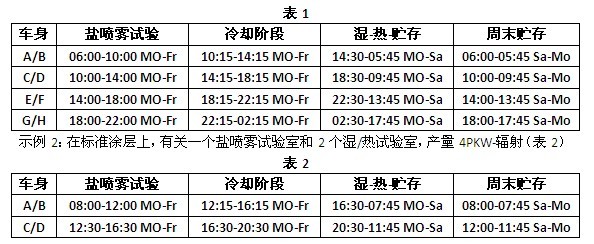 示例1:在5:30-22:30的生產(chǎn)運行時間上,有關(guān)一個鹽噴霧和4個濕熱試驗室(表1)每個試驗循環(huán)周期改裝時間大2次15分鐘, 產(chǎn)量8PKW-車身。