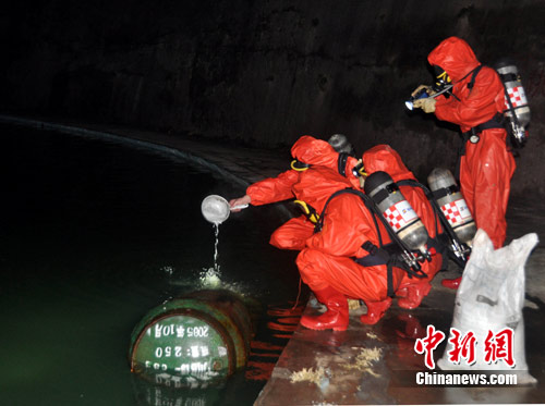 26日晚22時10分左右,四川廣元市區(qū)棲鳳路一游泳場發(fā)生氯氣泄漏事故,現(xiàn)場緊急疏散上千人民眾,有多人出現(xiàn)不同程度中毒。圖為消防官兵現(xiàn)場稀釋泄漏氯氣。中新社發(fā) 唐俊勇 攝