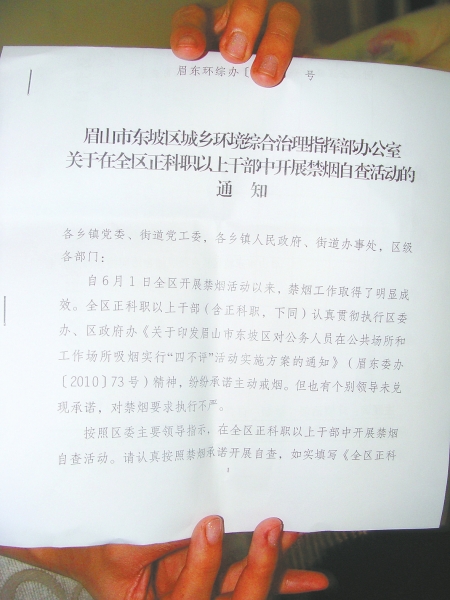 昨日上午,眉山市東坡區(qū)禁煙行動(dòng)辦公室(簡(jiǎn)稱“治理辦”)工作人員正在起草一份關(guān)于禁煙的文件。文件的題目是《眉山市東坡區(qū)城鄉(xiāng)環(huán)境綜合治理指揮部辦公室關(guān)于在全區(qū)正科職以上干部中開(kāi)展禁煙自查活動(dòng)的通知》,包括幾百字的文字和一份禁煙自查表。